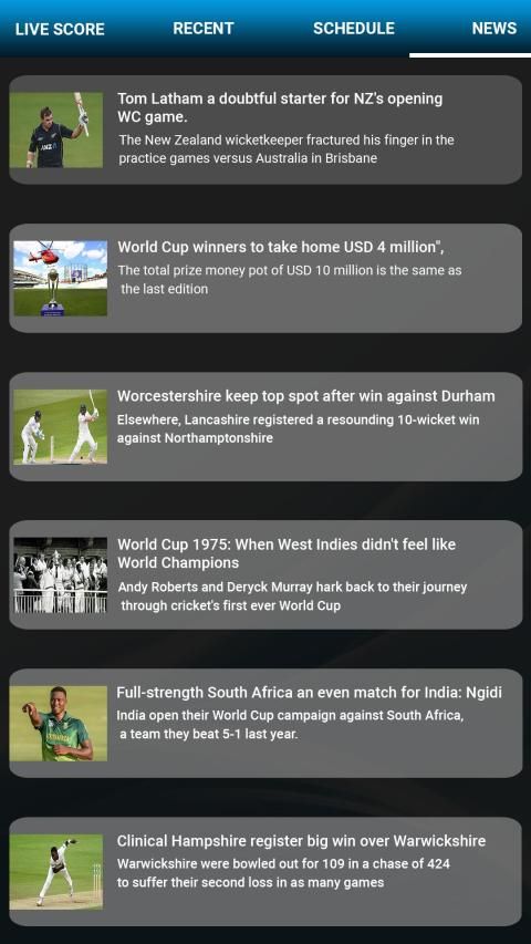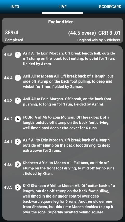 You will find features such as Ball by Ball live updates, commentary, upcoming matches schedules of all format like One Day matches, Test matches, T20 Matches with detailed score cards.