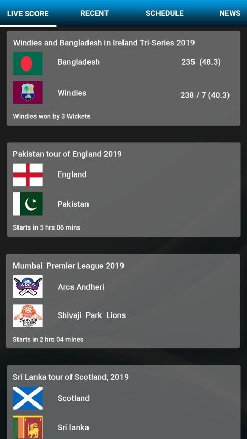 सभी क्रिकेट मैच स्कोर प्राप्त करने के लिए एक जगह जैसे नीचे सूचीबद्ध है।