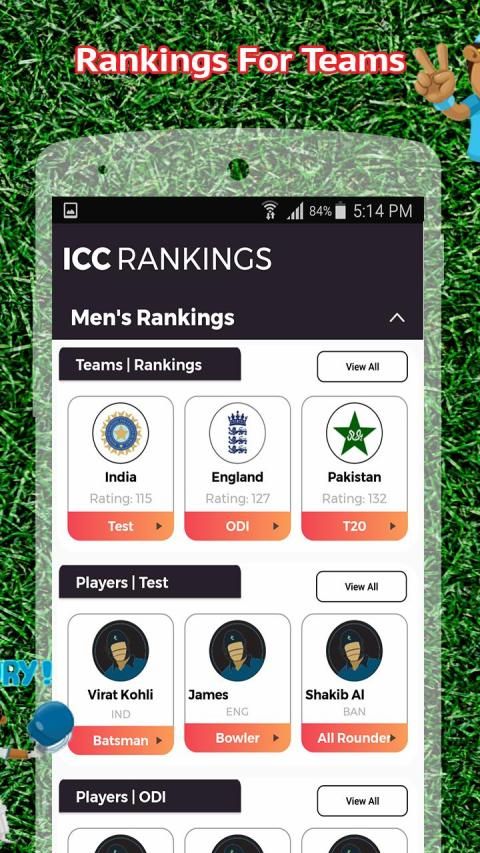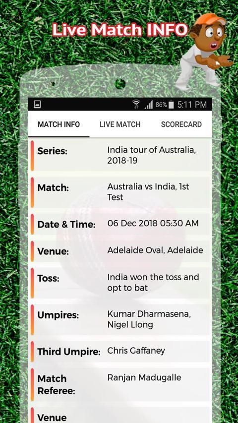 app provides ball-by-ball coverage of all international cricket matches (Test, ODI and T20),