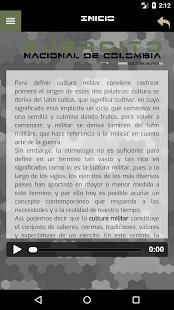 इस आवेदन में आप इस तरह के uniformology के रूप में कोलंबिया के राष्ट्रीय सेना के सैन्य संस्कृति के दृश्य तत्वों, की जानकारी (सैन्य वर्दी, बैज, पदक और बैज) मिलेगा, हेरलड्री, Vexilología (झंडे (हथियार और इकाई के धब्बे के कोट), बैनर, pennants और स्मारक संबंधों), संगीत Marcial (भजन, एनिमेशन, प्रदर्शनों, बिगुल कॉल, प्रार्थना, टोस्ट), Doctrinal शब्दावली (सैन्य शब्दावली) और इस विषय पर नियमों।