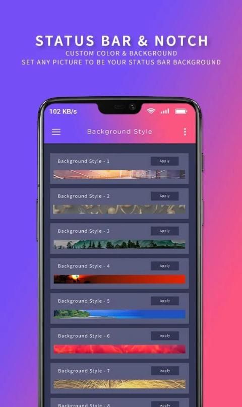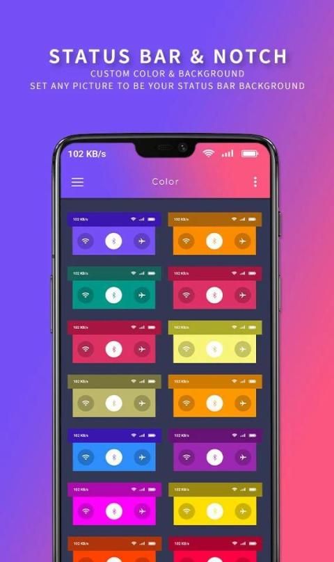 Status Bar & Notch - Custom Color & Background app with you can simply change the whole display look of your screen. customize your status bar or notification bar with your choice through amazing photo backgrounds, patterns frames, colors or gradient colors, etc,. App with also customize the shape your notch to make it a completely different look of your phone.