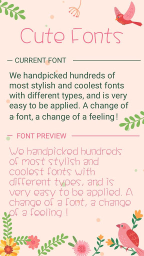 अपने फ़ोन को मुफ़्त में कस्टमाइज़ करने के लिए आप सैकड़ों फोंट डाउनलोड कर सकते हैं! अपने फोन टेक्सटिंग पर अपनी फ़ॉन्ट शैली बदलें। अपनी इच्छानुसार प्यारा, मीठा और रंगीन। इसे प्राप्त करने वाले पहले व्यक्ति बनें और अपने दोस्तों को इन अद्भुत फोंट में से एक के साथ आश्चर्यचकित करें! The यह आपके जीवन का सबसे सही विकल्प होगा। बस एक नया फ़ॉन्ट खोजें जिसे आप पसंद करते हैं, फिर आप स्क्रीन के अंत में डाउनलोड पर क्लिक करके खुद कर सकते हैं। यदि आप स्थापित करने में विफल रहते हैं, तो आपको फिर से प्रयास करना चाहिए या इसे पुनरारंभ करना चाहिए।