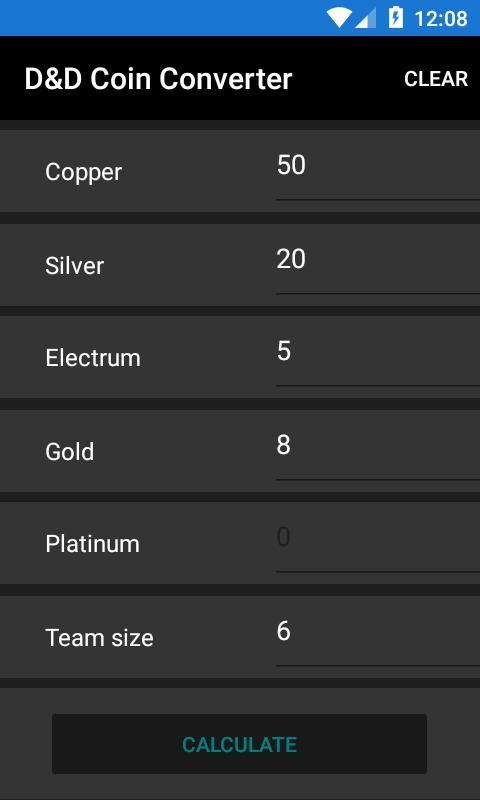 Splitting coins among team members after a fight or other event can be time-consuming and confusing. Even more so if the coins don't distribute evenly among the party. Enter the total currency and the number of party members and this app will take care of it.