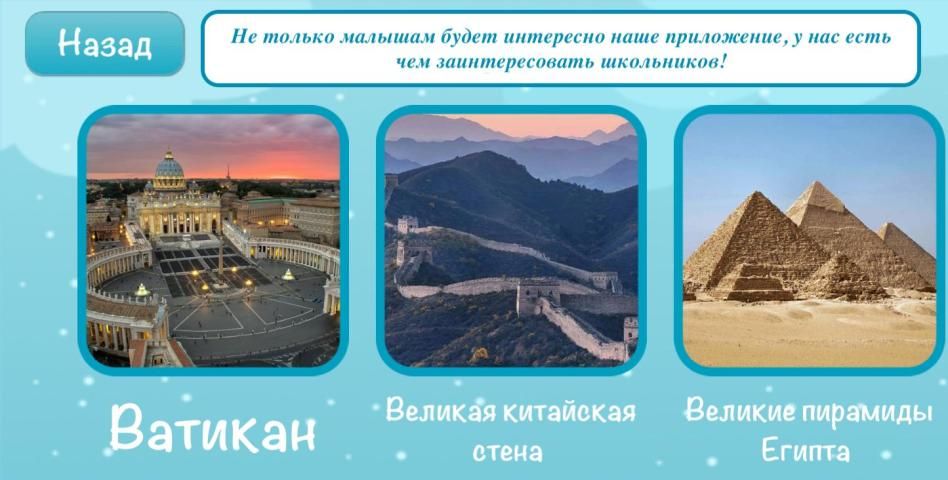 Таким образом маленькие дети смогут в интересной игровой форме выучить названия самых распространенных предметов, растений, продуктов, животных, а также изучить буквы, что поможет им в дальнейшем обучении. Ребятишки постарше «попутешествуют» по мировым достопримечательностям и узнают новые интересные факты об уже известных им вещах.