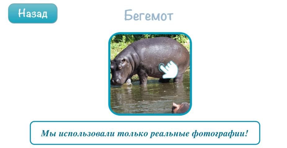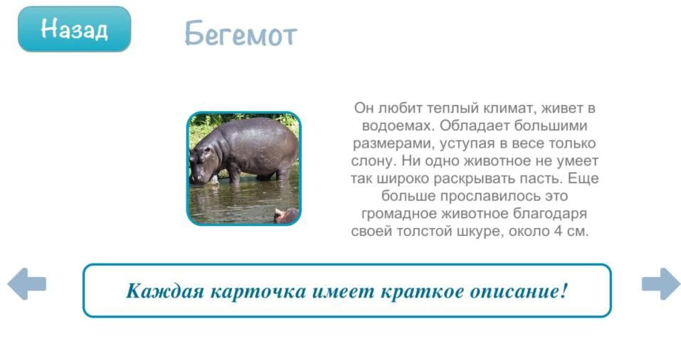 В каждый раздел входит от 15 до 35 карточек с фотографией предмета или животного, его названием и интересной информацией о нем. После просмотра можно пройти игровой тест для лучшего усвоения материала и закрепить результат.