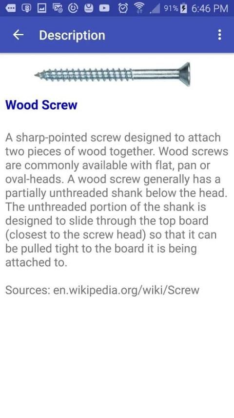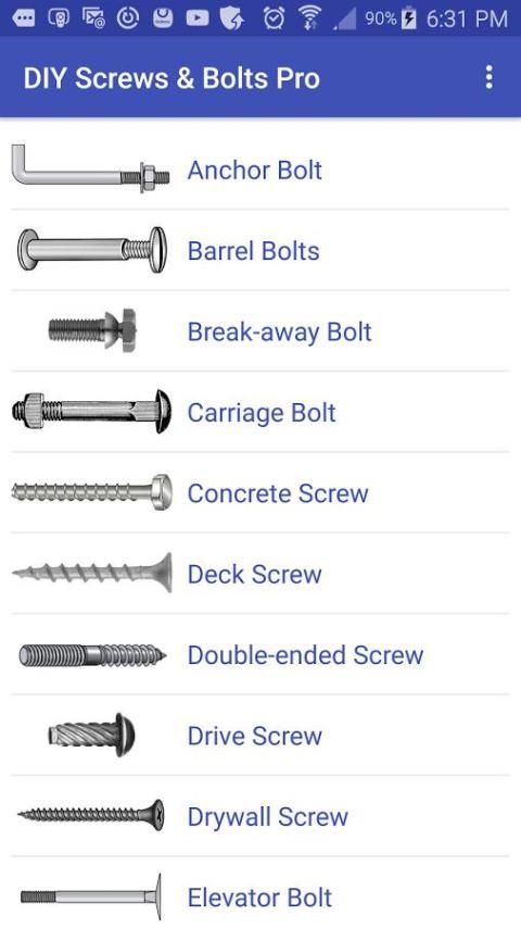 इस एप्लिकेशन का उद्देश्य एक कार्यशाला में या हार्डवेयर की दुकान में, शिकंजा और आप एक उत्पादन लाइन पर, एक निर्माण स्थल पर मिल जाने की संभावना है कि बोल्ट के 32 सबसे आम प्रकार के साथ उपयोगकर्ता परिचित है।