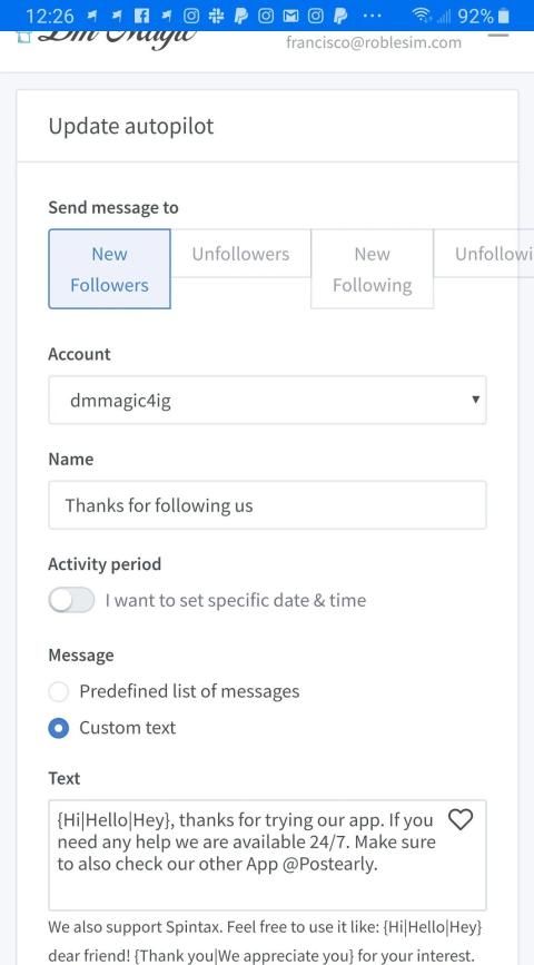 गर्मजोशी से स्वागत संदेश के साथ अनुकूलित पाठ संदेश भेजकर अपने नए अनुयायियों का अभिवादन करें। उपयोगकर्ताओं की अपनी सूची बनाएं और उन्हें इमोजी, पोस्ट, हैशटैग, वीडियो या फोटो के साथ पाठ संदेश भेजें।