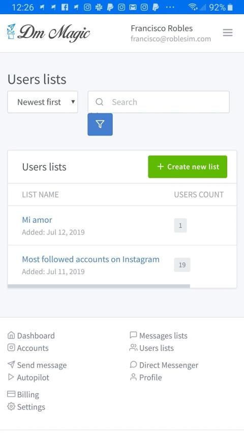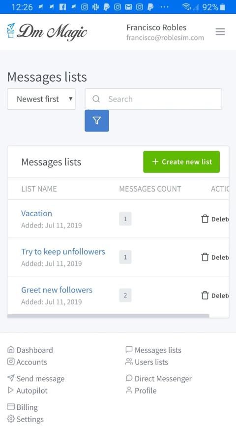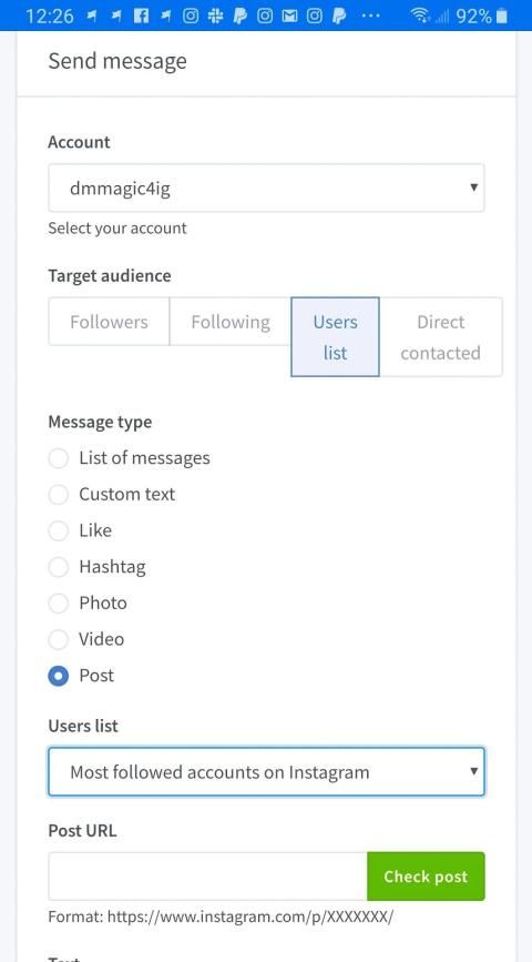 Greet with warm welcome message your new followers by sending customized text message. Create your own list of users and send them text message with emoji, post, hashtag, video or photo.