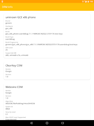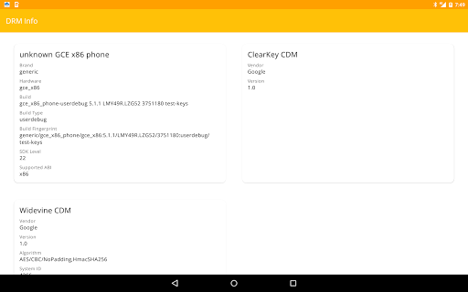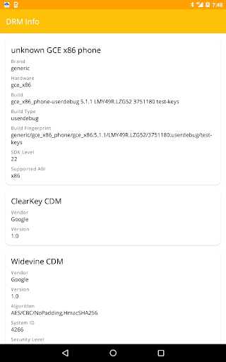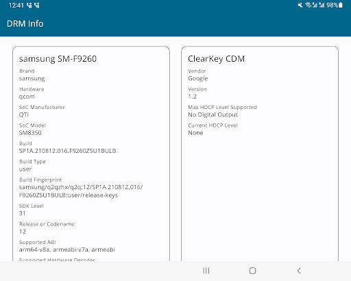 यह ऐप एंड्रॉइड मीडिया से डिजिटल राइट मैनेजमेंट (डीआरएम) मॉड्यूल की जानकारी प्रदर्शित करेगा फ्रेमवर्क और MediaDRM API।