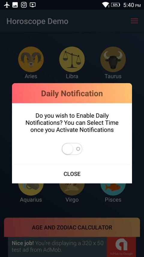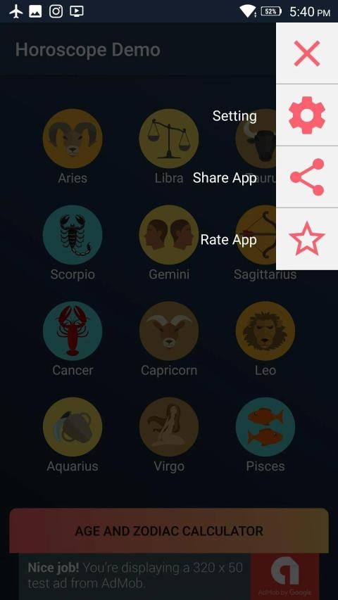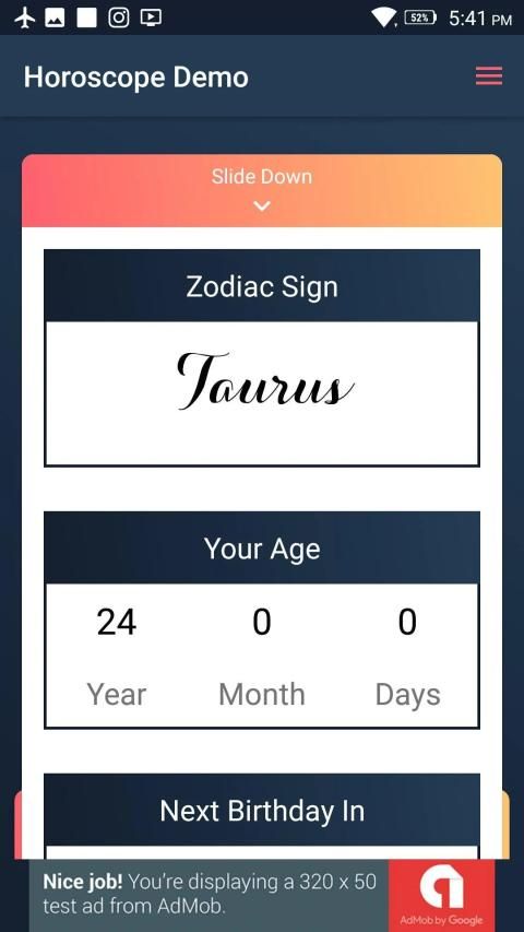 You can easily edit any data of application Command over Every add Turn on or off individual Ads Beautiful and Smooth Animations Very Easy to Re-Design and Edit Included Layered PSD, EPS and AI Files for Zodiac Sign Daily Notification based on User Time Input Age in Years, Months and Days Days remaining for next birthday Beautiful menu for Notification, Share app and Rate App Custom Notification Sound