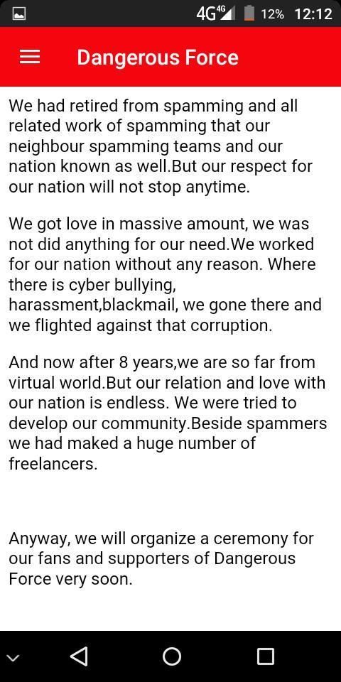 Dangerous Force is a Bangladeshi ethical Hacking team.It was founded on 20th Jun 2012.In 2011 foreign countries hackers and spammers was attacking on our social meadia's accounts and profile's.Than a sunny generation of our motherland, ,was felt for need a team, which will be protect our cyberspace from this types of social media attack.After on year his operation was succeeded and fulfilled,, he was success to make a team for protecting our cyberspace. And that was DANGEROUS FORCE