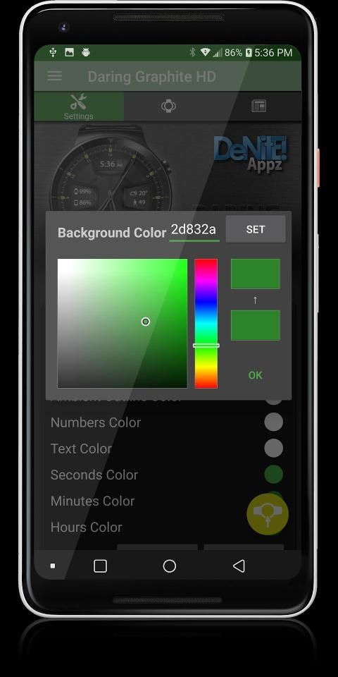 ✔ Color picker to select any color you like for the background, clock hands, text, & numbers