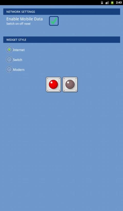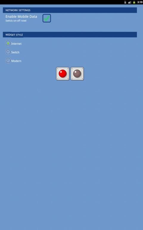 यह अधिक से अधिक लचीलापन देने के अपने मुख्य आवेदन में विकल्पों के साथ एक मेनू के साथ इस विजेट का प्रयोग कर अपने 2 जी 3 जी इंटरनेट मोबाइल डेटा कनेक्ट और डिस्कनेक्ट.
