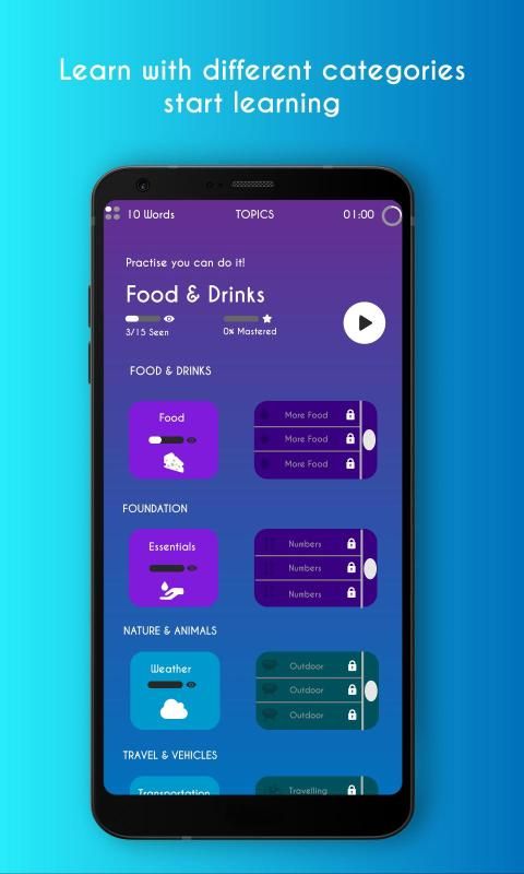 10 minutes of fast, racy and epic learning per day 2 hours weekly and 10 hours monthly, over 2000+ words in 100+ topics. More devoted language learners can have a feature for faster progress and, of course, unlimited learning time.