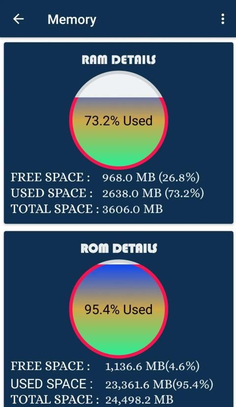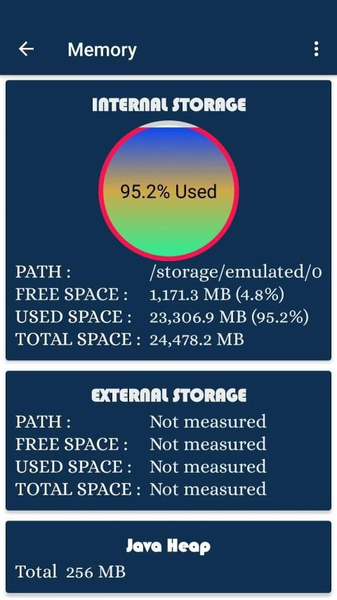 RAM(Free, Used, Total), ROM(Free, Used, Total), External(Free, Used, Total), Heap(Total)