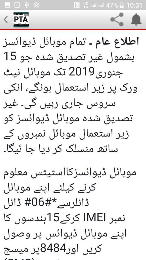 Your mobile device IMEI is compliant (PTA Approved) This message indicates that the mobile device is PTA compliant. You can use this mobile device and continue receiving network services. Your mobile device is PTA approved and fulfils all codal requirements of Government of Pakistan. Such users do not need to take any action