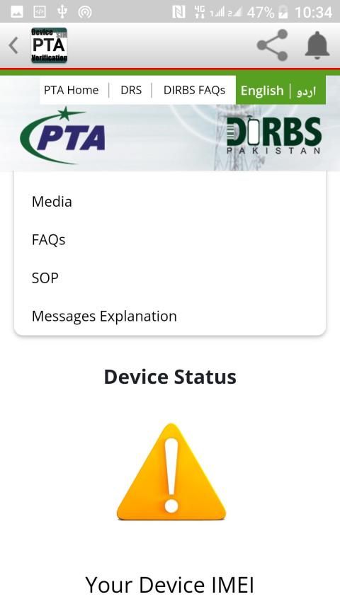 आपका मोबाइल डिवाइस IMEI आज्ञाकारी है (PTA स्वीकृत) यह संदेश इंगित करता है कि मोबाइल डिवाइस PTA अनुरूप है। आप इस मोबाइल डिवाइस का उपयोग कर सकते हैं और नेटवर्क सेवाएं प्राप्त करना जारी रख सकते हैं। आपका मोबाइल उपकरण पीटीए स्वीकृत है और पाकिस्तान सरकार की सभी कोडल आवश्यकताओं को पूरा करता है। ऐसे उपयोगकर्ताओं को कोई कार्रवाई करने की आवश्यकता नहीं है