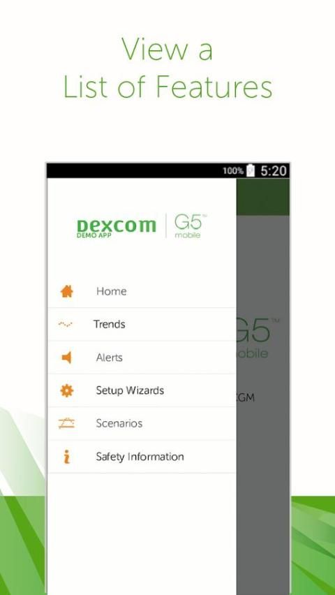 Dexcom G5 मोबाइल सिम्युलेटर एप्लिकेशन Dexcom G5 मोबाइल सीजीएम प्रणाली, दुनिया का पहला निरंतर ग्लूकोज की निगरानी प्रणाली है कि सीधे एक स्मार्ट मोबाइल डिवाइस पर ग्लूकोज डेटा प्रदर्शित करता है से सुविधाओं पर प्रकाश डाला गया।
