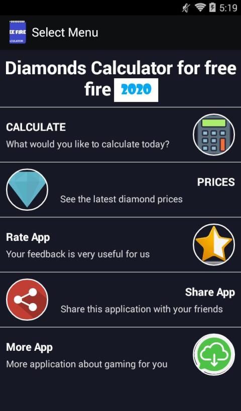 I'm glad to tell you that 30,000+ users downloaded Diamonds Calc for Free Fire 2020 latest version on 9Apps for free every week! The app has made a strong effect. This hot app was released on 2020-01-22. To read more info about mobile apps, you can click on 9Apps.