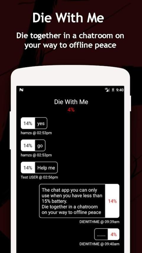 चैट एप्लिकेशन आप केवल का उपयोग आप 15% से कम बैटरी है जब कर सकते हैं। ऑफ़लाइन शांति के रास्ते पर एक chatroom में एक साथ मर जाते हैं।