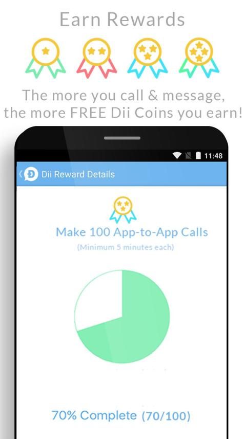 The more calls you make, and messages you send, the more free Dii Coins you earn! Dii Coins can be spent on free international calls to any mobile & landline phone number, and on in-app content purchases.