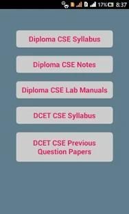 In this app, you can get Diploma CSE all Subjects Notes and Lab Manuals. It also contains Diploma syllabus, DCET syllabus and DCET previous year Question Papers. Application contains all Semesters notes and lab manuals of Computer Science and Engineering branch. You can access all the notes, lab manuals for all subjects and also Syllabus and Previous Question Papers under one roof.