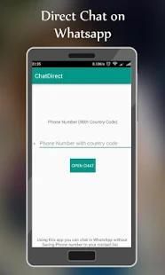 Direct Chat for WhatsApp is very easy and simple application to use, and send chat messages with WhatsApp without saving the phone number. Simply open this app and enter the destination phone number with country code then click the button then the application will be opened and you can then send message.