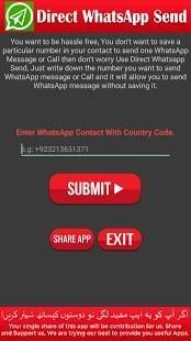 आप परेशानी मुक्त होना चाहता हूँ, तुम नहीं अपने संपर्क में एक विशेष संख्या को बचाने के लिए भेजने के लिए एक WhatsApp संदेश या तो कॉल चिंता मत करो उपयोग प्रत्यक्ष Whatsapp भेजें, बस नंबर पर आप WhatsApp संदेश या कॉल भेजना चाहते हैं लिख चाहते हैं और यह आप सहेजे बिना WhatsApp संदेश भेजने के लिए अनुमति देगा।