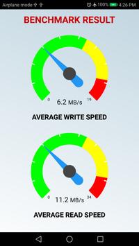 In a less than a minute, you can measure write speed as well as read speed for the different disks mounted to your device (Internal disk or External SD card).