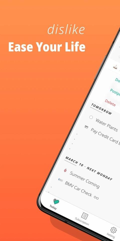 Dislike integrates many typical everyday life affairs into Subscriptions, such as annual motor vehicle inspection, credit card repayment, health check, etc. Covering health, finance, house keeping, travel, and public services.