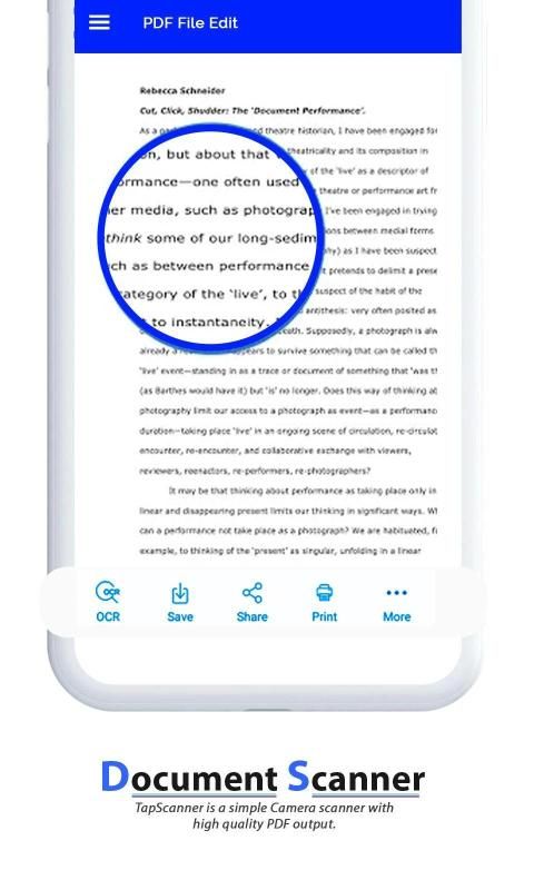 यह किसी डिवाइस या छवि को स्कैन करने की अनुमति देता है, मोबाइल डिवाइस के कैमरे का उपयोग करके, पीडीएफ फाइल में एक छवि प्राप्त करने के लिए, आवश्यकता के अनुसार तुरंत सहेजने, संपादित करने या साझा करने में सक्षम होने के लिए।