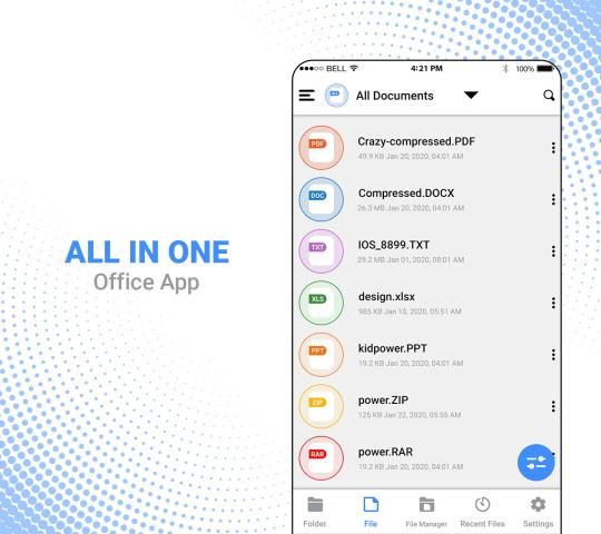 डॉक्यूमेंट व्यूअर - वर्ड, डॉक्स, पीडीएफ, स्लाइड और शीट वर्ड, एक्सेल, पॉवरपॉइंट, टेक्स्ट, पीडीएफ और कंप्रेस फाइल जैसे सभी फाइल डॉक्युमेंट्स को पढ़ने के लिए समर्थित है।