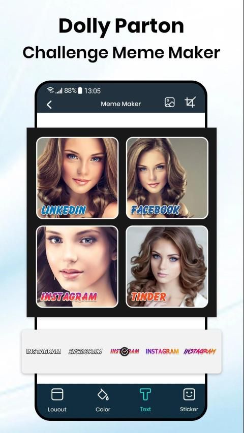 The last picture, labeled Tinder, shows Parton crouched in a sitting position wearing a Playboy bunny outfit. Parton captioned the picture Get you a woman who can do it all," with a wink emoji. After Parton posted the meme, several others followed including celebrities like Olivia Munn, Ellen DeGeneres, Janet Jackson, and Will Smith. You've probably even noticed some of your friends and family getting in on the new meme. And if you want to join the fun, here are five apps you can use to do the Dolly Parton Challenge on Instagram.