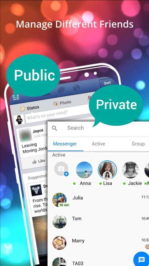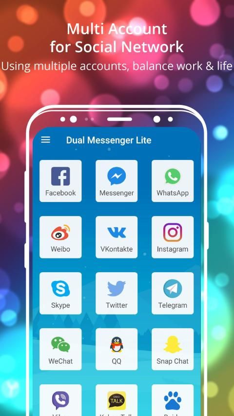 Dual Messenger help you easily to log in multiple accounts and keep them all online realtime! No worry about data storage problem of different accounts, we will keep your data separated.