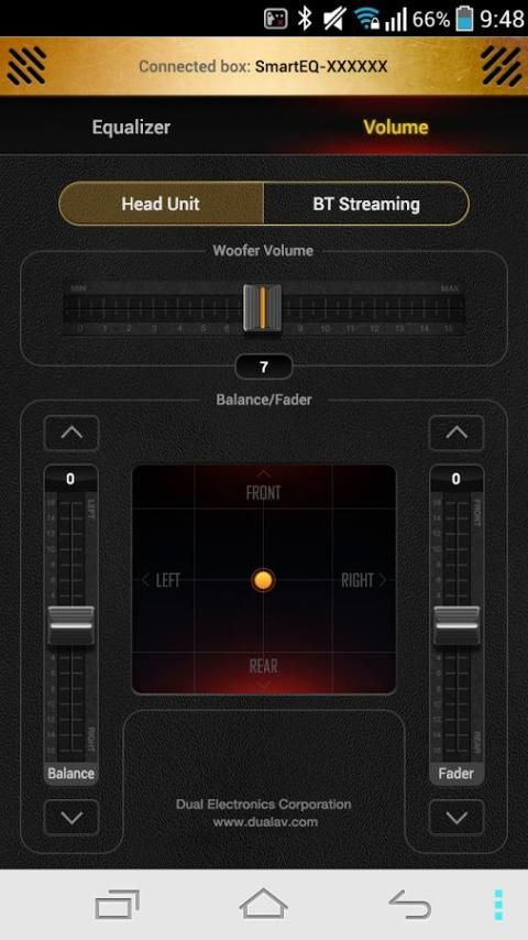 स्मार्ट EQ के प्रोसेसर उपयोगकर्ता एंड्रॉयड डिवाइस जुड़ा हुआ है, इस तरह के एक ब्लूटूथ से पॉप, रॉक, और जाज के रूप में 7 EQ के बैंड, साथ ही presets के आयतन (मुख्य और उप), शेष / पिता को नियंत्रित करने के लिए अनुमति देता है। प्रोसेसर स्वचालित एम्पलीफायर मोड़ पर, स्पीकर और आरसीए आदानों, और ब्लूटूथ ऑडियो स्ट्रीमिंग प्रोफाइल (A2DP) के लिए संवेदन संकेत। अधिक जानकारी के लिए उत्पाद www.dualav.com जाएँ।