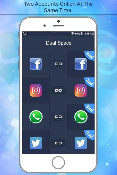 - दोहरी अंतरिक्ष एक ही समय में एक ही अनुप्रयोग के एक से अधिक खातों को संभालने के लिए सबसे अच्छा अनुप्रयोग है। समानांतर और अलग काम और जीवन के लिए एक साथ एक ही अनुप्रयोग के एक से अधिक खातों चलाने के लिए और खेल खातों के लिए अधिक संसाधनों को प्राप्त करें।