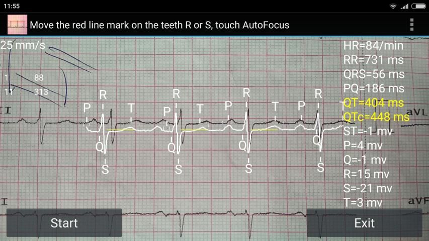 आवेदन ईसीजी के चयनित क्षेत्र को पढ़ता है (स्कैन करता है) और ईसीजी के बुनियादी मानकों की गणना करता है: