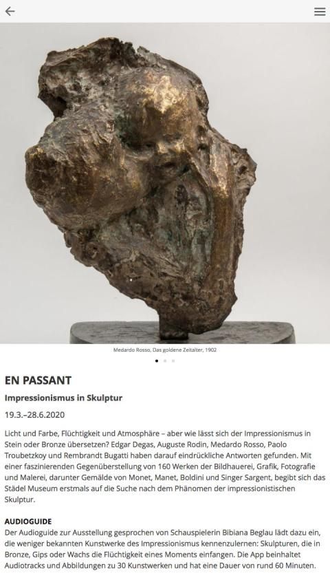 Der Audioguide zur Ausstellung gesprochen von Schauspielerin Bibiana Beglau lädt dazu ein, die weniger bekannten Kunstwerke des Impressionismus kennenzulernen: Skulpturen, die in Bronze, Gips oder Wachs die Flüchtigkeit eines Moments einfangen. Die App beinhaltet Audiotracks und Abbildungen zu 30 Kunstwerken und hat eine Dauer von rund 60 Minuten.