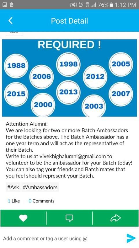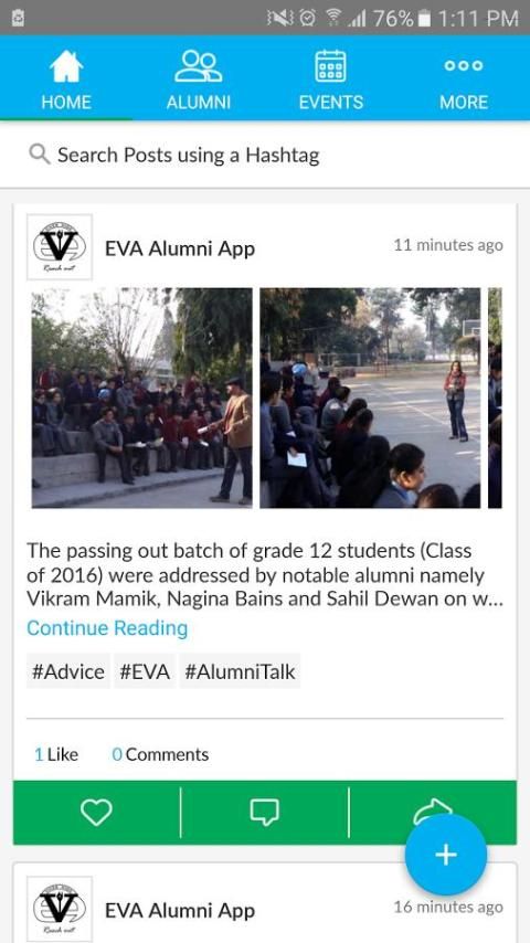 ईवा पूर्व छात्रों एप्लिकेशन को कनेक्ट करने के लिए विवेक हाई स्कूल के पूर्व छात्रों के लिए एक मंच प्रदान, सहयोग और एक दूसरे के साथ और स्कूल के साथ संलग्न करेंगे। पूर्व छात्रों साथी पूर्व छात्रों, शेयर सामग्री, लेख और पदों के बारे में जानकारी का उपयोग करने में सक्षम हो जाएगा। स्कूल के पूर्व छात्रों खबर, उपलब्धियों और पूर्व छात्रों की घटनाओं के माध्यम से अद्यतन रखने के लिए सक्षम हो जाएगा।