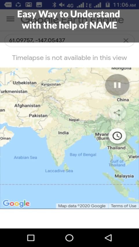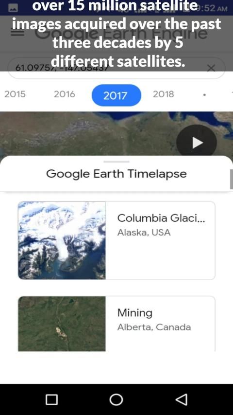 टाइमलैप्स एक उदाहरण है जो पृथ्वी इंजन की क्लाउड-कंप्यूटिंग मॉडल की शक्ति को दिखाता है, जो उपयोगकर्ताओं, जैसे वैज्ञानिकों, शोधकर्ताओं और पत्रकारों को Google के कम्प्यूटेशनल बुनियादी ढांचे और मल्टीटाबाइट्स पृथ्वी इंजन का उपयोग करके परिवर्तन, मानचित्र रुझानों का पता लगाने और पृथ्वी की सतह पर अंतर का पता लगाने में सक्षम बनाता है। डेटा कैटलॉग।