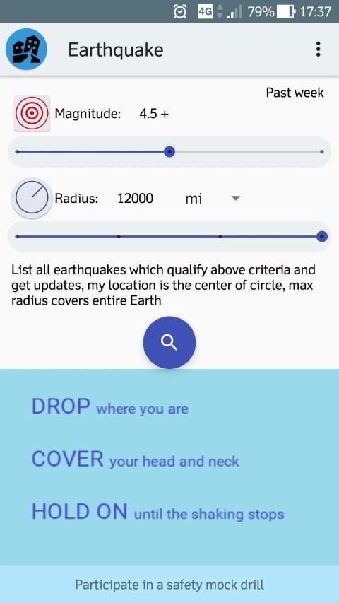 Choose magnitude 2.5+ or 4.5+ or significant, and define a circular region in which you want to know about earthquake occurrences by choosing radius between 500 - 12,000 mile, device location is the center of the circle. Time options are dependent on magnitude.