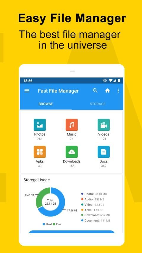 आसान फ़ाइल प्रबंधक एक शक्तिशाली एंड्रॉइड फ़ाइल प्रबंधक है , स्पष्ट वर्गीकरण आपको चित्र, वीडियो, संगीत, दस्तावेज़, स्थापना पैकेज, संपीड़ित पैकेज और अन्य फ़ाइलों को जल्दी से खोजने की अनुमति देता है,