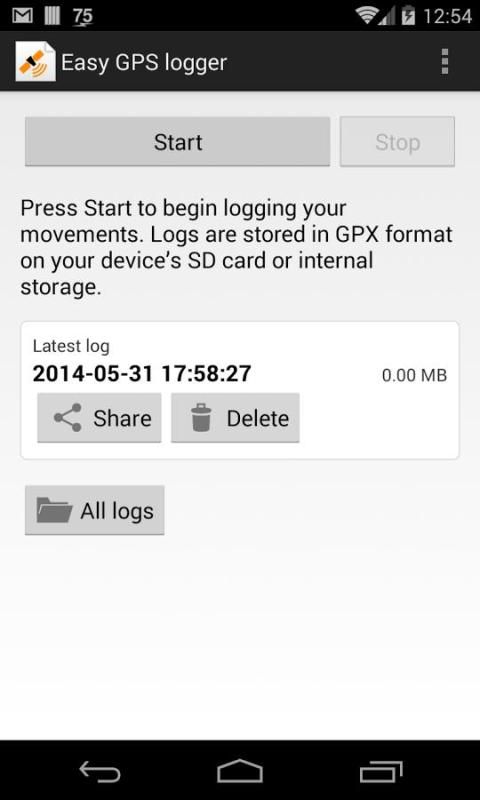 इस app जीपीएस पर बदल जाता है और मानक GPX प्रारूप में एक लॉग फ़ाइल के लिए (एक बार प्रति सेकंड) अपने स्थान रिकॉर्ड.