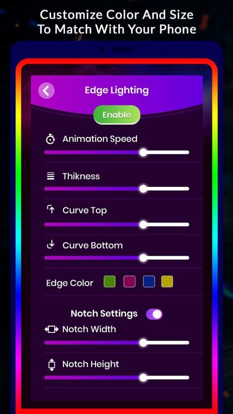 EDGE LIGHTING- it has the option to change your simple wallpaper with animated live edge wallpaper.it has the option to change the animation speed, the thickness of edge effects, curve shape with bottom or top, apply notch setting and one best option changes color of notch setting.
