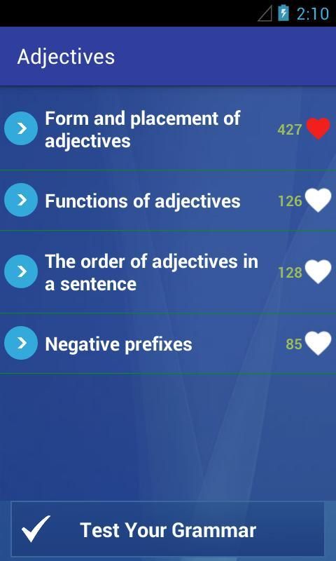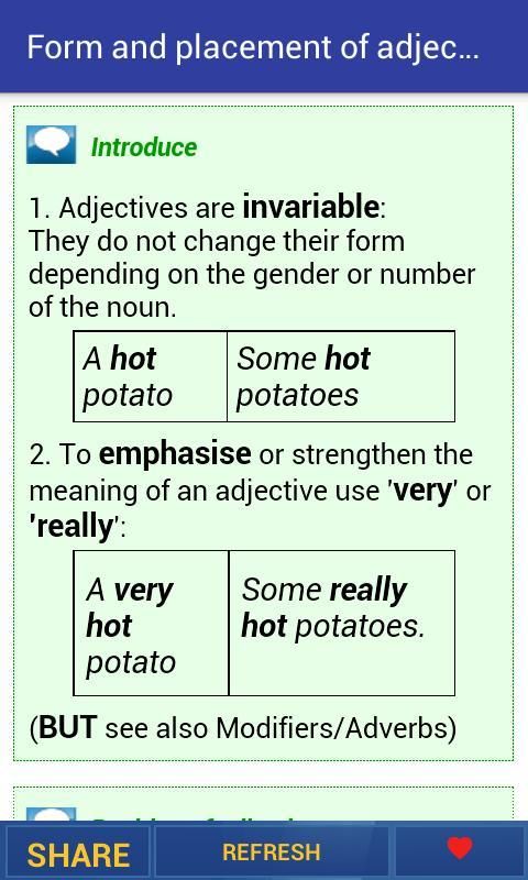 आप अंग्रेजी काल में जान सकते हैं, विशेषण का उपयोग कैसे करें ... इस एप्लिकेशन के साथ। यह एक अंग्रेजी व्याकरण अभ्यास उपकरण है। उपयोग में अंग्रेजी व्याकरण।