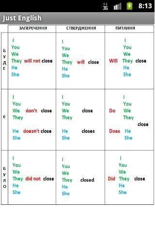 Zaperechuvalna, सकारात्मक और प्रश्नवाचक, और तीन बार:: अतीत, वर्तमान और भविष्य इसकी संरचना मेज, जो अभिव्यक्ति की तीन रूपों के होते अनुसार बनाया गया है. यूक्रेनी भाषा में एक वाक्य के लिए आमंत्रित कर रहे हैं, और जो शब्दों का एक सेट के साथ अंग्रेजी में एक वाक्य रचना करने के लिए.