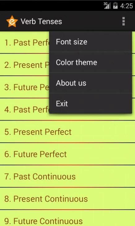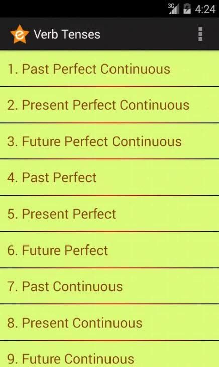 यह अंग्रेजी क्रिया tenses के संदर्भ के लिए एक छोटा सा उपकरण है. यह एक सब अंग्रेजी क्रिया काल और अनियमित क्रिया सूची है. बस अपने मोबाइल फोन पर स्थापित है, तो आप एक दिन में इसकी जरूरत होगी.