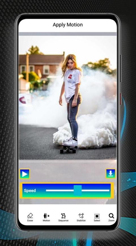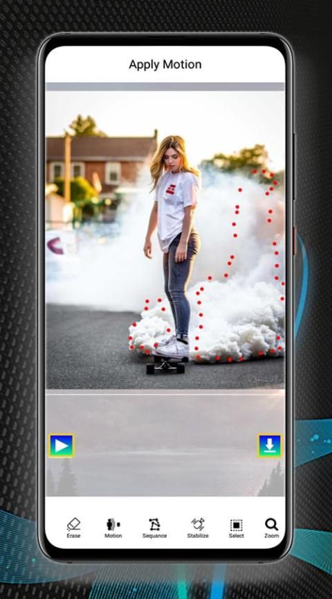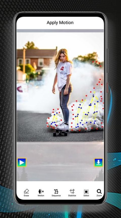 - Photo In Motion Loop Cinemagraph effect lets you apply motion on animation effect on particular object, just select the area and give direction for motion blur immersive video.