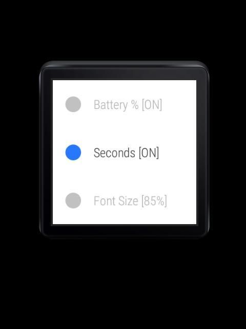 12/24 घंटे मोड, काला या उल्टे, फ़ॉन्ट आकार और टाइपफेस, फ़ॉन्ट रूपरेखा (क्योंकि पृष्ठभूमि के समर्थन के लिए), और कुछ अन्य चीजों को चालू करने के लिए (तिथि, सेकंड, शीर्ष परिवेश बैटरी लाइन) पर सफेद: वहाँ कुछ विन्यास विकल्प हैं।