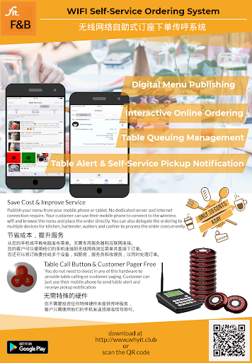 मेनू प्रकाशित करने, ऑर्डर लेने, बुकिंग और स्थानीय वाईफाई कनेक्शन के माध्यम से कॉलिंग और पेजिंग के लिए प्रतिक्रिया देने के लिए अपने मोबाइल डिवाइस को रेस्तरां, फूड कोर्ट और हॉकर सेंटर के लिए एक सर्वर में बदल दें। इंटरनेट कनेक्शन और समर्पित सर्वर की आवश्यकता नहीं है। ग्राहक मोबाइल डिवाइस रेस्तरां बजर सिस्टम के लिए एक रिसीवर बन सकता है। और ग्राहक रेस्तरां कॉलिंग सिस्टम में अपने मोबाइल डिवाइस से दूर से डेस्क बेल को ट्रिगर कर सकता है। सभी किसी विशेष हार्डवेयर की आवश्यकता के बिना इस ऐप का उपयोग करके किया जाता है।